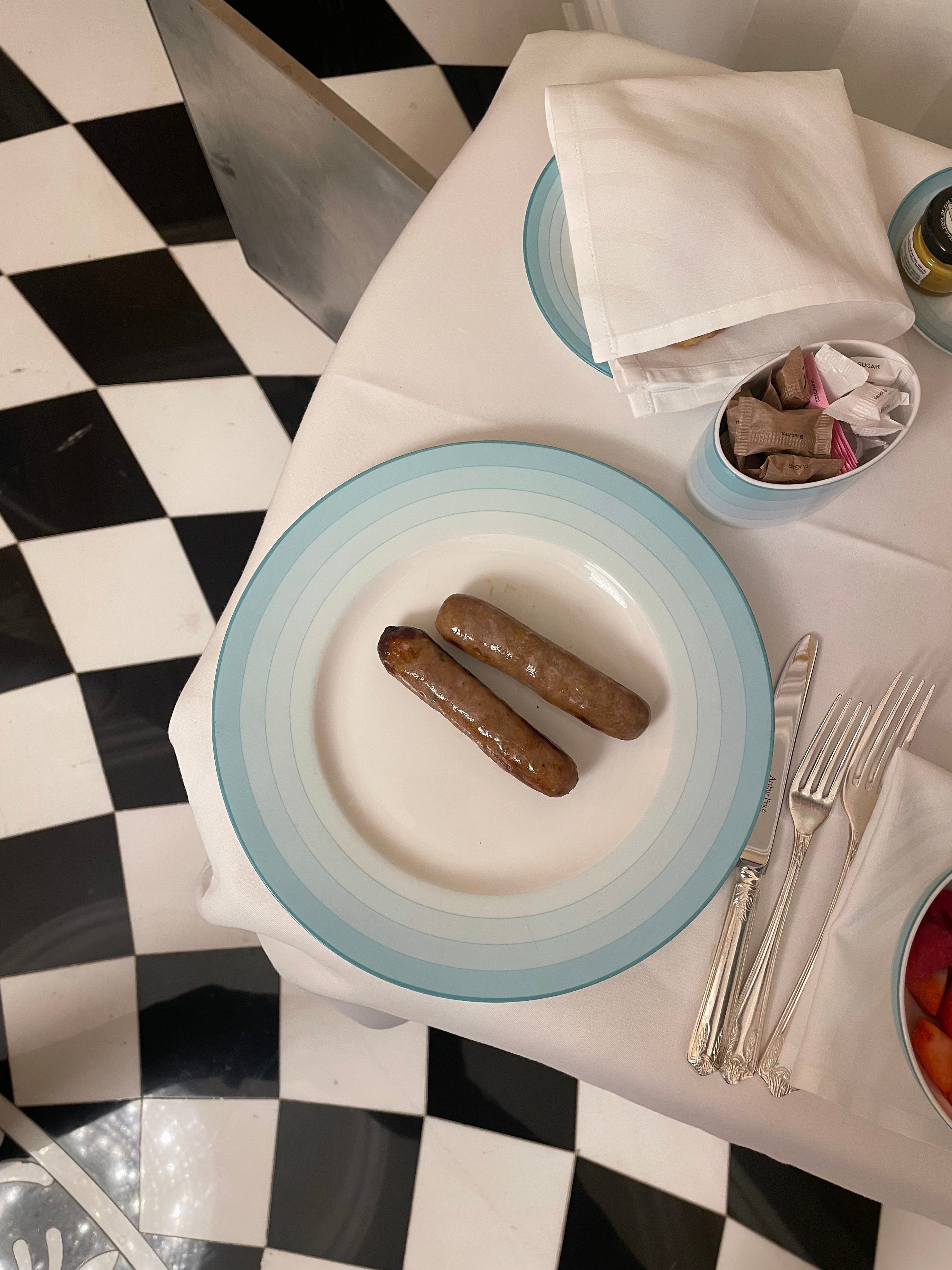 Found my next hyperfix, and it’s ordering a cheeky side of sausages, which happened when I deserted my family for a solo night at Claridge’s. At breakfast, two extra fingers of pork are very I’m on vacation in Europe and the day is going to unfurl pleasantly in front of me as I work my way through this vintage penguin paperback. At lunch you order them “for the table” but you know it’s a lie. At dinner, they go well with oysters, making you feel like a banqueting mean-spirited king just before a witch punishes him for his attitude. Of all the phallic treats—gherkins, corn dogs, mini-milks—they’re they most joyous, like chewing a Sunny D. I think of a side-sausage as a meat cigar: a superfluous addendum that brings the moment to life.